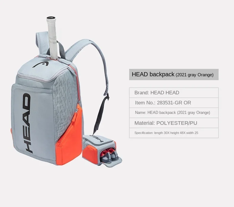 The backpack is perfect. I believe it is the same manufacturer as the head itself. Excellent size. There was a pair of sneakers, two ball tubes, a change of clothes, a face towel, two bottles, cap, in addition to the two rackets. Besides being very beautiful. Very satisfied.