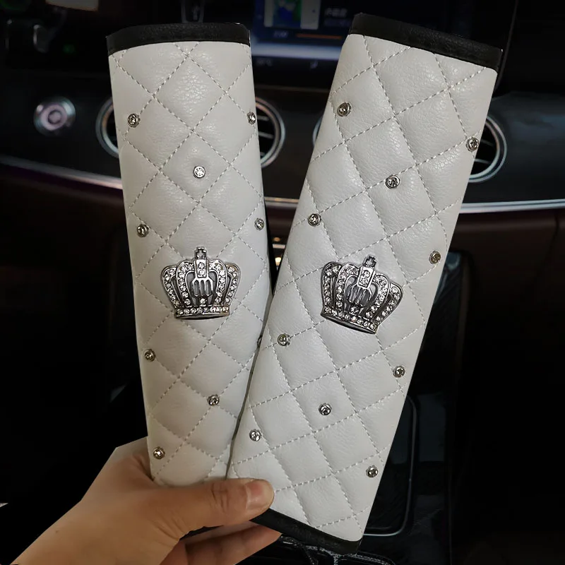 2pcs Fashion Crystal Rhinestone Crown Car Safety Seat Belt Cover Leather Shoulder Pad Car Styling Seatbelts Pad Car Accessories