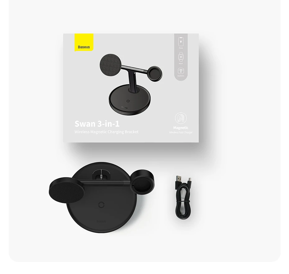 Excellent base. It is important to remember that it comes with a charger with 20W, to charge 3 devices at the same time is weak, I saw this reading the description and I bought a base with 65W from baseus itself.