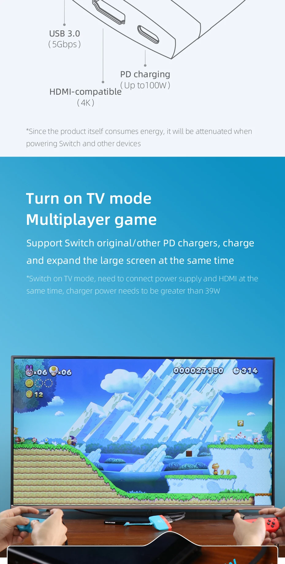 【Notice】 This USB C Adapter work with Nintendo Switch or Samsung DEX Mode requires external power source. We recommend that you use the original switch charger or a charger with an output greater than 39W to avoid affecting normal use