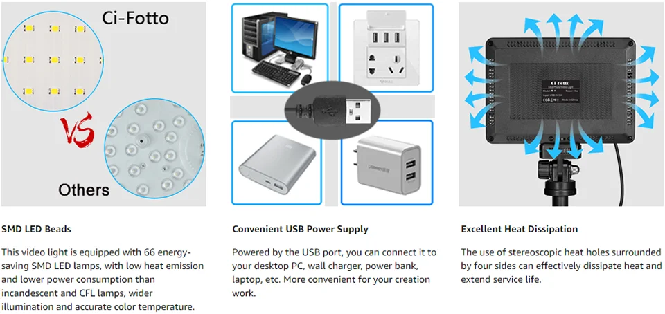 The light panel consists of 66 energy-saving LED lamps with adjustable brightness (10% to 100%) for excellent illumination. It doesn’t flicker even in low brightness.